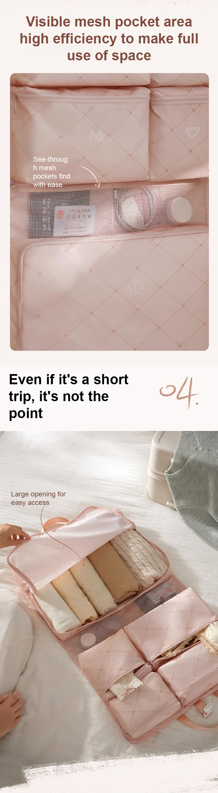 7 zones • mesh pockets • fits 3-4 outfits → folds flat • hangs in hotel • no digging ✓ waterproof • 🧺 machine-washable