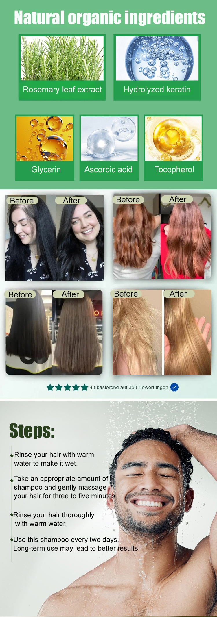 ✨ Organic plant extracts combined with hydrolyzed keratin help repair damaged hair, reduce breakage, and improve thinning hair. ⚡ Rosemary soothes the scalp, moisturizes hair, promotes healthy growth, and leaves hair stronger and fuller.